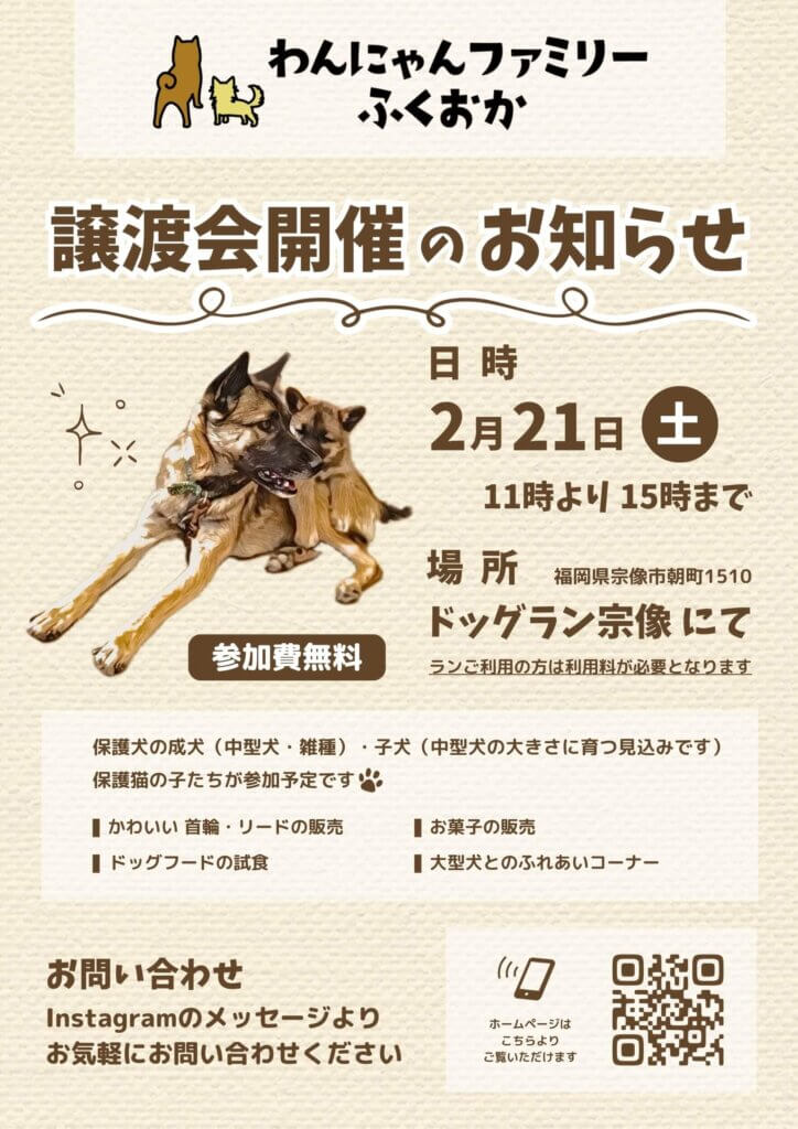 2026年2月21日(土)11時より、宗像ドッグランにて譲渡会を開催します。